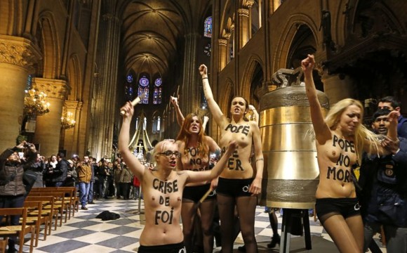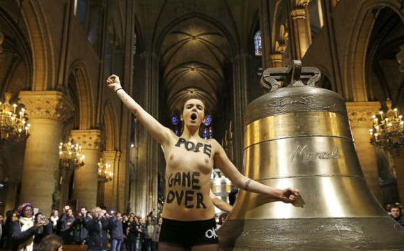 Смешавшись с толпой туристов, 8 активисток «Femen» прошли в неф собора, где выставлены 9 новых колоколов Нотр-Дам-де-Пари, которые будут установлены в соборе до 1 марта.