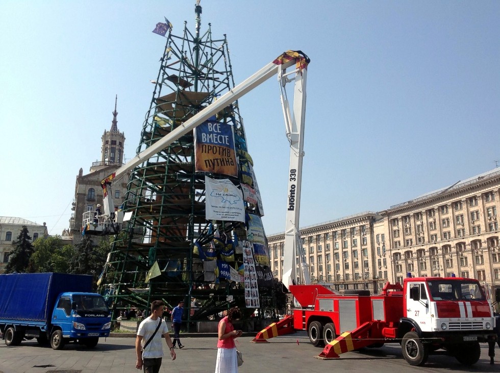 Один из работников службы рассказал, что все флаги, которые висят на каркасе елки, будут аккуратно сняты и переданы музею Майдана.