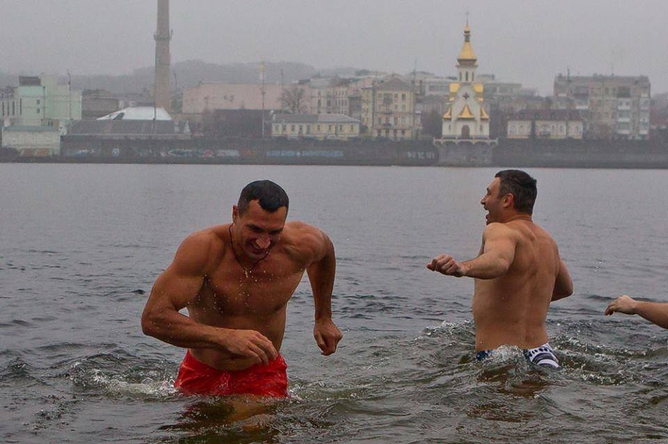 Сегодня, 19 января, на Крещение, мэр Киева Виталий Кличко вместе с братом-чемпионом по боксу Владимиром и казаками «4-го казачьего редута Майдана» купались в ледяном Днепре.