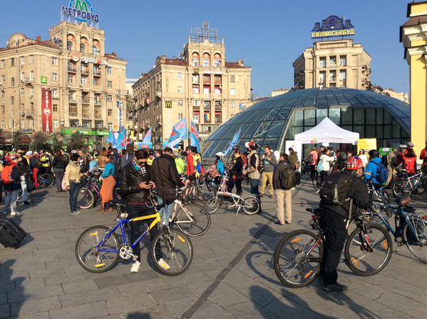 Сегодня с утра в Киеве более сотни велосипедистов собрались на Майдане Незалежности у Лядских ворот. Туда же приехал на велосипеде и мэр столицы Виталий Кличко.
