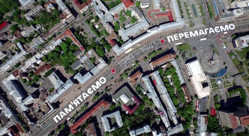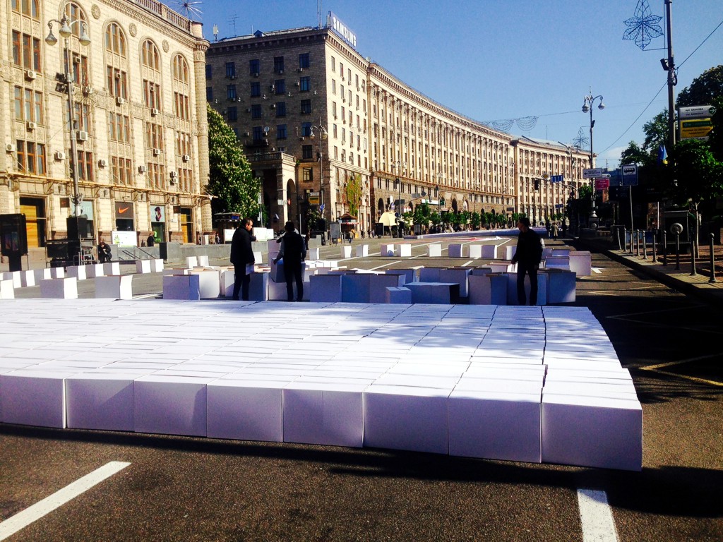 В субботу, 9 мая, в честь 70-той годовщины Победы над нацизмом на главной улице столицы Украины — Крещатике участники флешмоба выложили из белых коробок надпись «Пам'ятаємо-1939-1945-Перемагаємо».