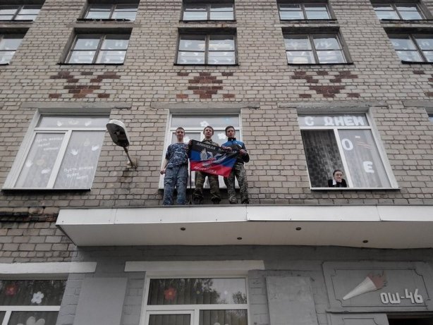 А заключительным кадром донецкого «школьного праздника» стало фото 3-х учеников, стоящих на козырьке входа в школу с флагом самопровозглашенной «ДНР».