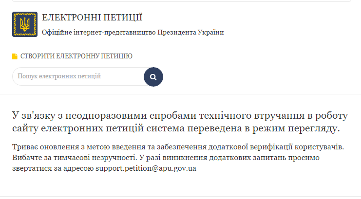 На официальном сайте президента Украины перестал работать сервис электронных петиций от населения.