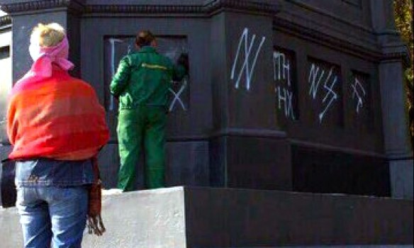 «Неизвестные разрисовали памятник свастикой и надписью ПТН ПНХ», — пишут «Українські новини».