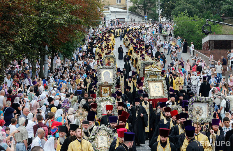 После молебна УПЦ МП провела Крестный ход, участники которого прошли по маршруту от Владимирской горки по улицам Грушевского и Мазепы до Киево-Печерской Лавры.