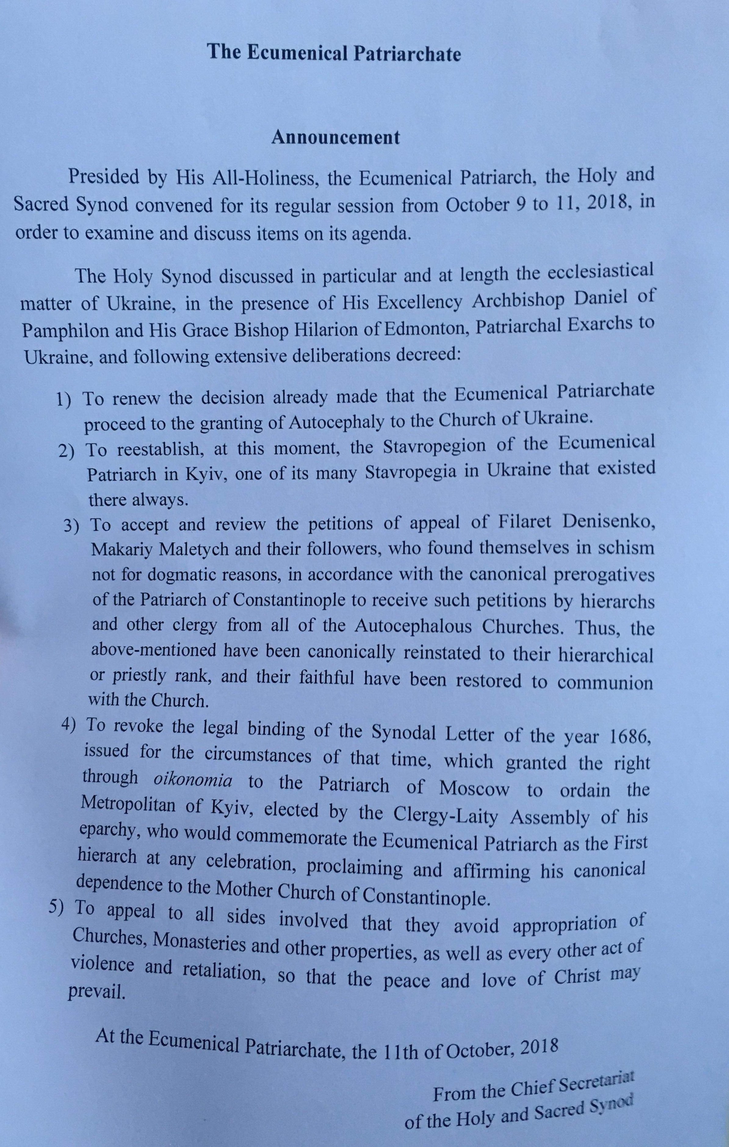 Священный Синод, в частности, подробно обсудил церковное дело Украины в присутствии архиепископа Памфилонского Даниила и епископа Эдмонтонского Иллариона, Патриарших экзархов Украины, и по итогам обстоятельных обсуждений принял соответствующее постановление, в котором говорится: «Подтвердить уже принятое решение о том, что Вселенский Патриархат приступает к предоставлению Автокефалии Церкви Украины».