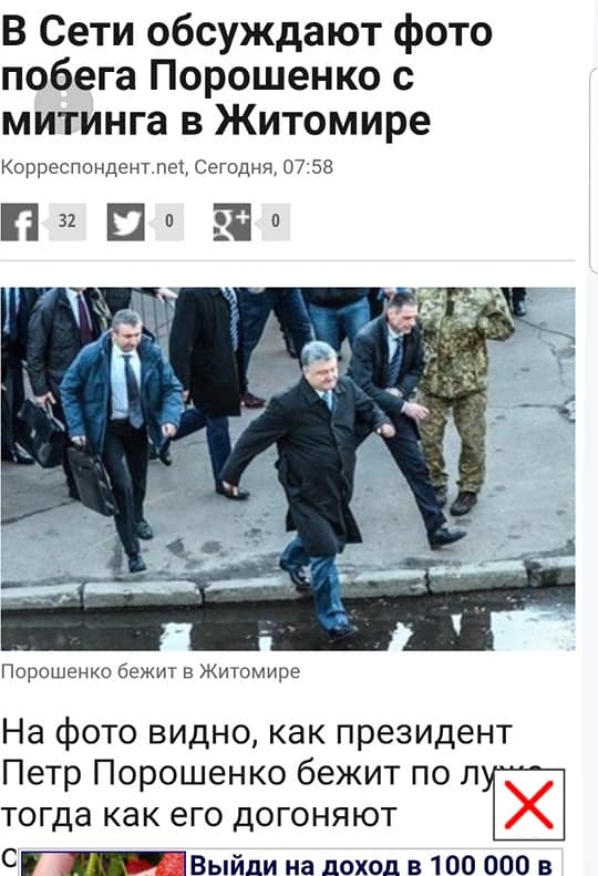В тексте речь идет о том, что российские издания RT, Первый канал, Life, РЕН ТВ, «Царьград», Пятый канал, Ura.ru, «Газета.Ru» опубликовали фотографию, на которой запечатлен Порошенко, якобы убегающий от членов националистической организации «Национальный корпус», пришедших на мероприятие в Житомире 11 марта.