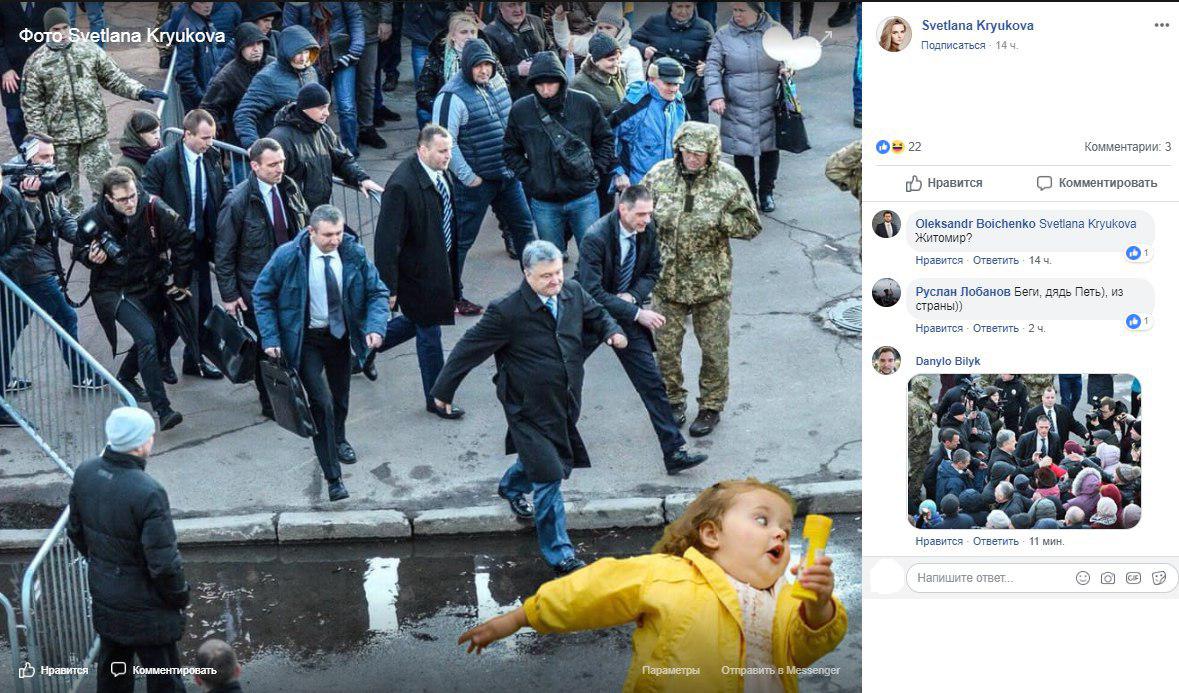 «А после митинга Порошенко был вынужден быстро уходить с места проведения, что и запечатлено на этой фотографии», — отметили журналисты издания в комментарии под фото.