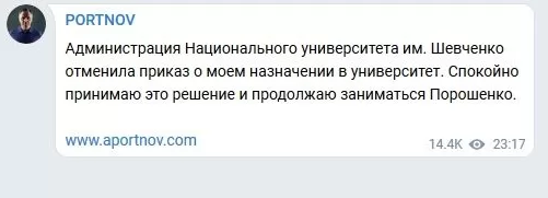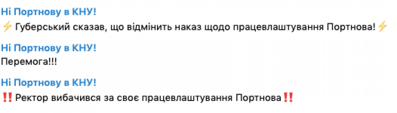 Кроме того, как сообщается в Telegram-канале «Ні Портнову в КНУ», ректор извинился за трудоустройство Портнова.