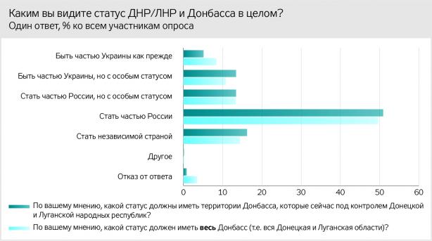 При этом возврат оккупированных районов Донецкой и Луганской области в состав Украины на прежних условиях желают лишь 5,1% местных жителей. Особого статуса региона в составе Украины желают 13,4% опрошенных. 16,2% настаивают на независимости региона. Объединение с Россией желают 50,9% жителей ОРДЛО. Еще 13,4% считают, что «ЛНР» и «ДНР» должны войти в состав РФ с «особым статусом».