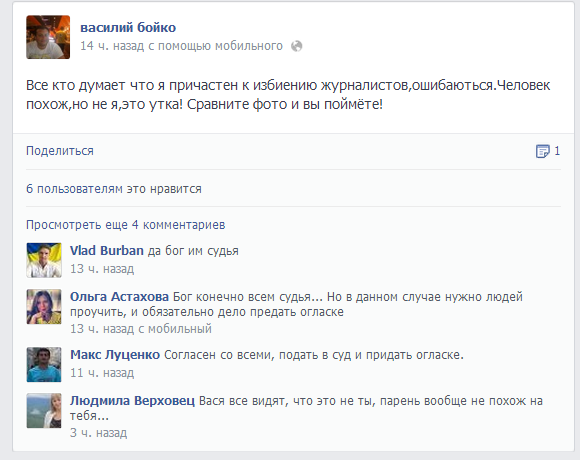 На своей странице в соцсети фейсбук он написал, что те, кто думает о его причастности к избиению журналистов, ошибаются.