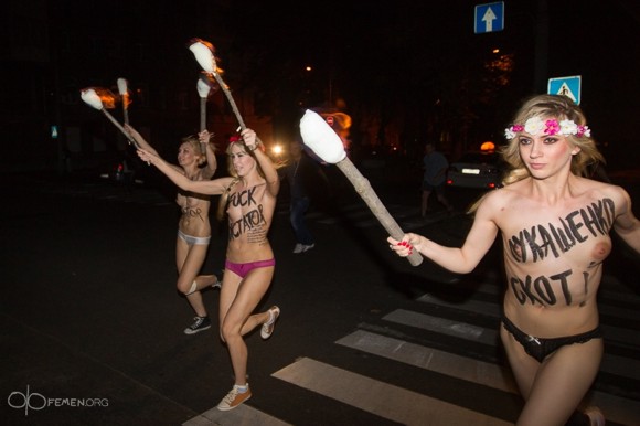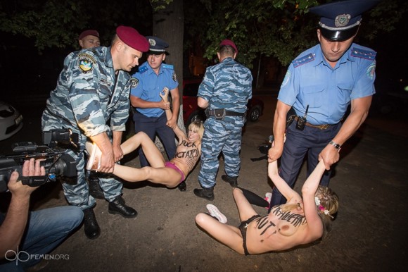 «FEMEN призывает мир к психологической войне с диктаторами! Преследуйте кровопийц и днем и ночью, не давайте им время ни на сон, ни на отдых!», — говорится в заявлении пресс-службы Femen.