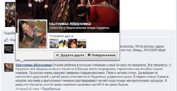 Солистка Национальной оперы Украины Екатерина Абдуллина отправила свою дочь учиться в русскоязычную школу, поскольку считает украиноязычных людей «морально нездоровым быдлом».