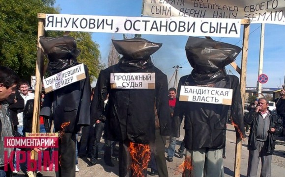 Более 250 человек вышли сегодня на улицы Вилино с вилами, плакатами и чучелами — «обнаглевшего рейдера», «продажного судьи» и «бандитской власти». Во время акции протеста пайщики установили виселицу, повесив на ней все три чучела. Верх конструкции украшал транспарант с текстом «Янукович, останови сына». Селяне сожгли чучела вместе с виселицей, после чего подожгли старый «Москвич-412» возле конторы агрофирмы «Крым». Таким образом, люди требуют остановить беспредел агрофирмы, которая отбирает у них землю.