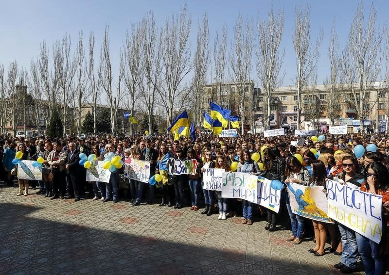 Студенты вышли с национальной символикой Украины, в руках у них были украинские флаги, а также желтые и голубые воздушные шарики. Основные лозунги вышедших на мирный митинг жителей города – «Украина – едина», «Луганщина – это Украина», «Луганщина – территория без оружия и войны», «Мы любим Украину», «Мы за мир».