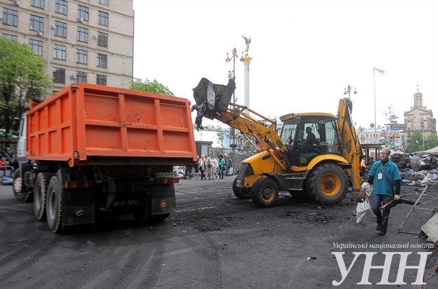 Во вторник, 22 апреля, в Киеве работники коммунальных служб начали разбирать баррикаду возле Дома профсоюзов со стороны Европейской площади.
