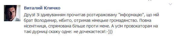 «С удивлением прочитал растиражированную «информацию», что мой брат Владимир, якобы, получил немецкое гражданство. Полная чушь, направлена больше против меня. А всем провокаторам на такие глупости скажу одно: не дождетесь :-)))», — написал на своей странице в фейсбуке Виталий Кличко.