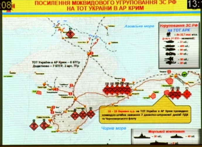 В частности, по его словам, в середине марта на крымском полигоне «Опук» армия РФ отрабатывала высадку воздушного и морского десанта с участием 2-х батальонов и артиллерии. После окончания учений военные подразделения остались в районе полигона, позже к ним присоединились еще 5 батальонов.