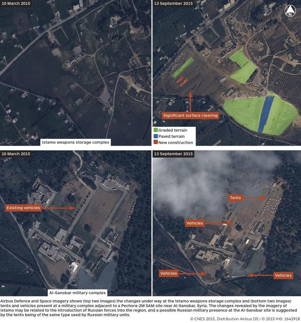 «Изображения показывают склады с оружием и военным оборудованием к северу от Латакии, что указывает на намерении разместить военных на обоих объектах», — цитирует газета слова редактора Jane's Intelligence Review Роберта Манкса.