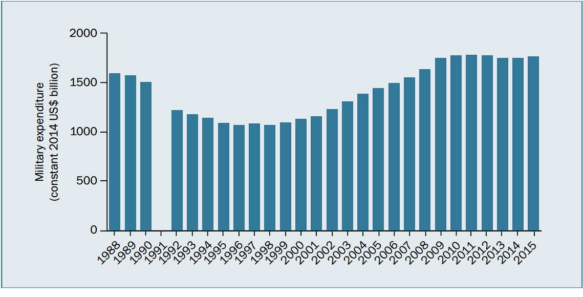 По данным Стокгольмского института исследования проблем мира SIPRI, глобальные военные расходы в 2015 году увеличились впервые за четыре года.
