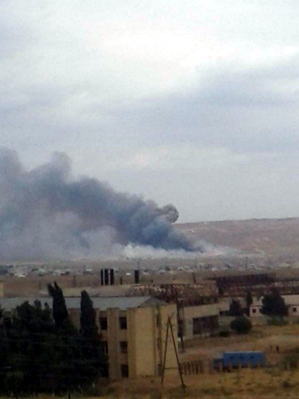 В соцсетях появилась видео из окрестностей Ширвана, на котором видно как над заводом поднимается столб дыма и слышны хлопки.