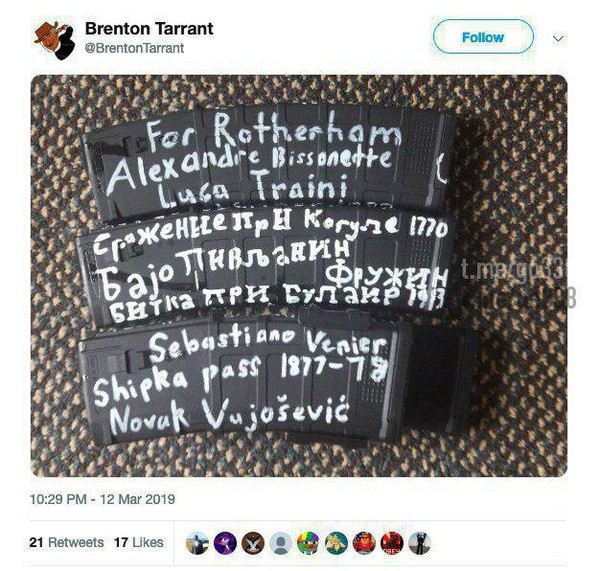 Перед нападением австралиец выложил в своем Twitter (сейчас его учетная запись заблокирована) 73-страничный манифест — так же, как сделал норвежский националист Андерс Брейвик перед своим нападением в июле 2011 года.