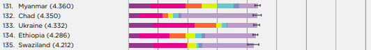 Украинский «индекс счастья» за год поднялся более чем на 0,3, обеспечив тем самым подъем в рейтинге счастливых стран мирана на 5 пунктов, однако по-прежнему остается во второй сотне. «Соседями» Украины в рейтинге стали Мьянма, Свазиленд, Эфиопия и Чад.