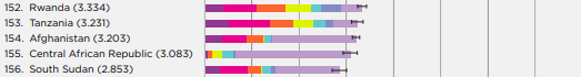 В конце рейтинга преимущественно африканские страны (Руанда, Центральная Африканская Республика, Танзания) и Афганистан. Закрывает рейтинг самых счастливых стран Южный Судан (2,85).