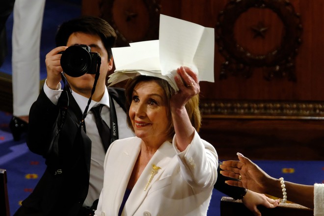 В конце речи она встала и разорвала свою копию замечаний, которые Трамп ей вручил. Позже она заявила, что это была «вполне вежливая» реакция на выходку президента.