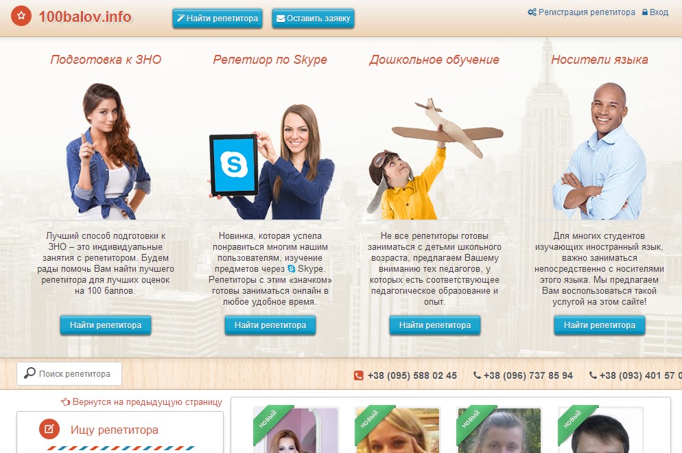 Это поиск репетитора для подготовки к ЗНО (внешнее независимое тестирование), занятий удаленно с использованием Skype, обучения дошкольников и услуги изучения языка с его носителем. Нажатие на каждое из них выводит список всех специалистов данного профиля. Дальше можно уточнить поиск: выбрать определенный город, предмет, возраст и пол преподавателя, опыт репетиторства и стаж преподавания, время и место занятий, вид занятий, уровень и возраст ученика. Благодаря этому вы не обратитесь с заявкой по подготовке студента к репетитору, который учит только школьников.
