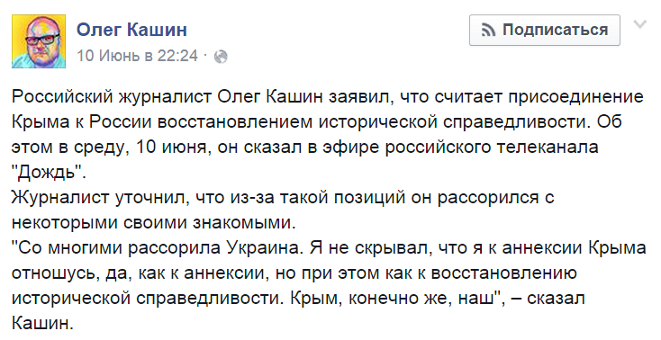 Кашин: Я не скрывал, что я к аннексии Крыма отношусь, да, как к аннексии, но при этом как к восстановлению исторической справедливости. Крым, конечно же, наш. Он отметил, что его поколение «все эти годы» мечтало о присоединении Крыма к России.