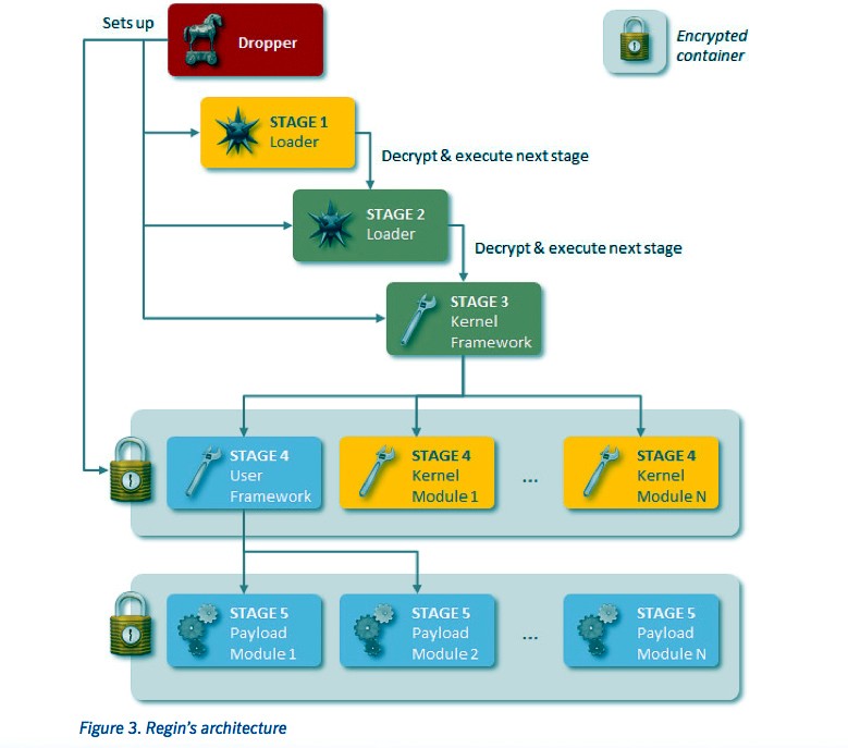 Regin использует внедренный метод декодирования, поэтапно расшифровывая себя. Ключ к расшифровке каждого компонента находится в предшествующем ему компоненте. Поэтому аналитикам трудно исследовать угрозу в самом начале, поскольку у них нет всех компонентов и всех ключей.
