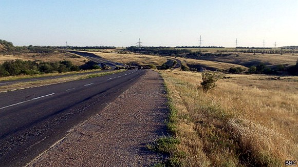 Трасса Донецк-Мариуполь все еще в приличном состоянии и даже те участки дорожного полотна, которое растерзали гусеницы танков, не становятся помехой для быстрого передвижения. Однако магистраль длиной почти в 110 километров навевает тревожное настроение. На ней вплоть до самого горизонта пусто. Встречаются лишь единичные машины в течение многих минут путешествия.