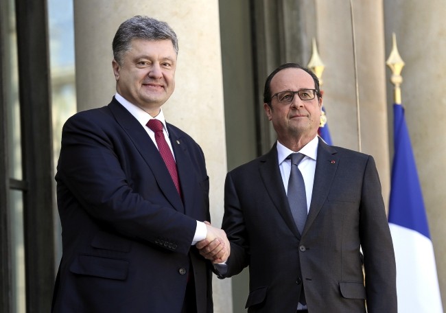 В среду, 22 апреля, Франсуа Олланд принял у себя в Елисейском дворце Петра Порошенко. Главы двух государств обсудили ряд вопросов в связи с предстоящим 21 мая саммитом «Восточного партнерства» в Риге, коснулись Минских соглашений и возможности отправки на восток Украины миротворческой миссии. До пресс-конференции Олланд и Порошенко подписали совместную декларацию, в которой подчеркнули важность принятия мер, необходимых для выполнения минских договоренностей. В декларации отмечается также ответственность российской стороны за конфликт на востоке Украины.