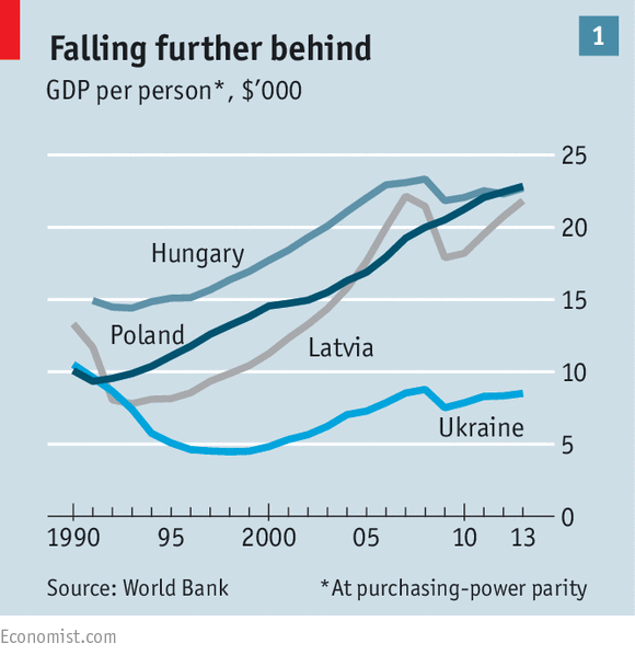 Даже еще до вторжения России на восток Украины в прошлом году перед Украиной стояла очень непростая задача проведения экономических реформ. Население страны находится в более бедственном положении, чем на момент распада Советского Союза. Жизнь в Украине буквально пронизана коррупцией. Работники ГАИ в любой момент могут потребовать взятку, а в газетах рекламируют фирмы, которые сделают вам любой реферат или дипломную работу. В условиях войны к этому набору хронических проблем добавились новые и очень серьезные — разрушение большей части производственной базы страны, отток инвесторов и кризис платежного баланса. Если Украина решила создать стабильную экономику, то ей необходимо будет решить проблему с государственным бюджетом, восстановить имеющий первостепенное значение газовый сектор и искоренить коррупцию — и все это на фоне неурегулированного конфликта.