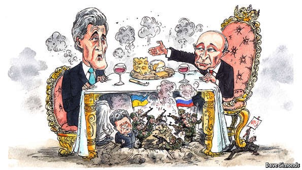 Страшные кадры войны, которые постоянно появлялись на российском телевидении в прошлом году, сопровождались рассказами о дипломатических победах России и неудачах Украины. Согласно «Первому каналу», если война возобновится, ее будут вести отчаявшиеся украинцы. И эта новая версия рассчитана не только на российскую аудиторию. Как только г-н Керри покинул Сочи, Россия отправила своих послов в Киев, чтобы сообщить украинскому президенту Петру Порошенко, что Америка и Европа его бросили. Целевой аудиторией российской пропаганды является также и Евросоюз, которому 22 июня предстоит решить вопрос о продлении или снятии санкций с России. Если Америка готова помириться, спрашивает Москва, зачем портить хорошие деловые отношения с нами?