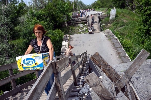 Находящаяся восточней, меньшая из двух сепаратистских «народных республик», которые Россия поддерживает на самой границе Украины после того, как революция «майдана» повернула остальную часть страны лицом к Западу, по мнению Киева, не принадлежит миру сему. Кроме пути по доскам между столбами моста, ведущего в станицу Луганская, здесь больше нет прохода в это призрачное государство