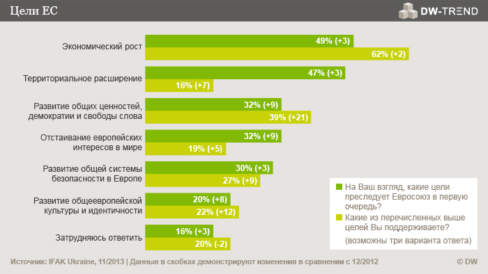 Главной целью Европейского Союза является, по мнению 49 процентов опрошенных, экономический рост. Такую цель поддерживают 62 процента украинцев. Почти треть опрошенных (32 процента) считает, что одной из целей ЕС является укрепление демократии и свободы слова. Развитие демократических ценностей явно волнует растущее число жителей Украины. Ведь уровень личной поддержки такой цели всего за год резко вырос с 18 до 39 процентов.